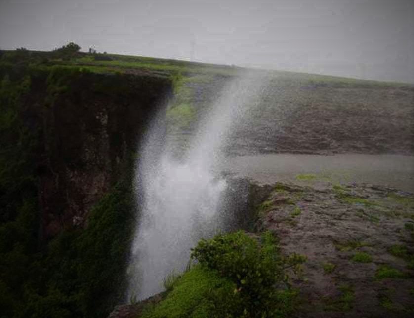 पठारावर मसाई मातेचं छोटेखानी देऊळ आहे. आम्ही तिथे दर्शन घेऊन काही वेळ विश्रांतीसाठी बसलो. पन्हाळ्याहून निघून सुमारे १२ ते १५ किमी चालणं झालं होतं. देवळाजवळ ४-५ मिनिटांसाठी थोडं ऊन पडलं होतं, सकाळपासून सतत पडणाऱ्या पावसामुळे आम्ही गारठून गेलो होतो म्हणूनच बहुतेक उन्हातही शांतता मिळते हे तेव्हा पहिल्यांदाच मला कळलं. ती ४-५ मिनिटं लगेच संपली आणि परत इंद्रदेवानी पावसाचा कहर सुरु केला. लगेचच धुकं पडलं आणि भयंकर पाऊस सुरु झाला. पावसामुळे छोटे छोटे ओढे वाहत होते आणि पठाराच्या कड्यावरून खाली कोसळत होते आणि त्यामुळेच शेकडो छोट्या मोठ्या धबधब्यांची निर्मिती होत होती. आम्ही पठाराच्या कडे कडेनी चालत होतो आणि पुढे एका ठिकाणी अत्यंत आश्चर्यजनक दृश्य पाहिलं. चक्क उलटा वाहाणारा धबधबा…!